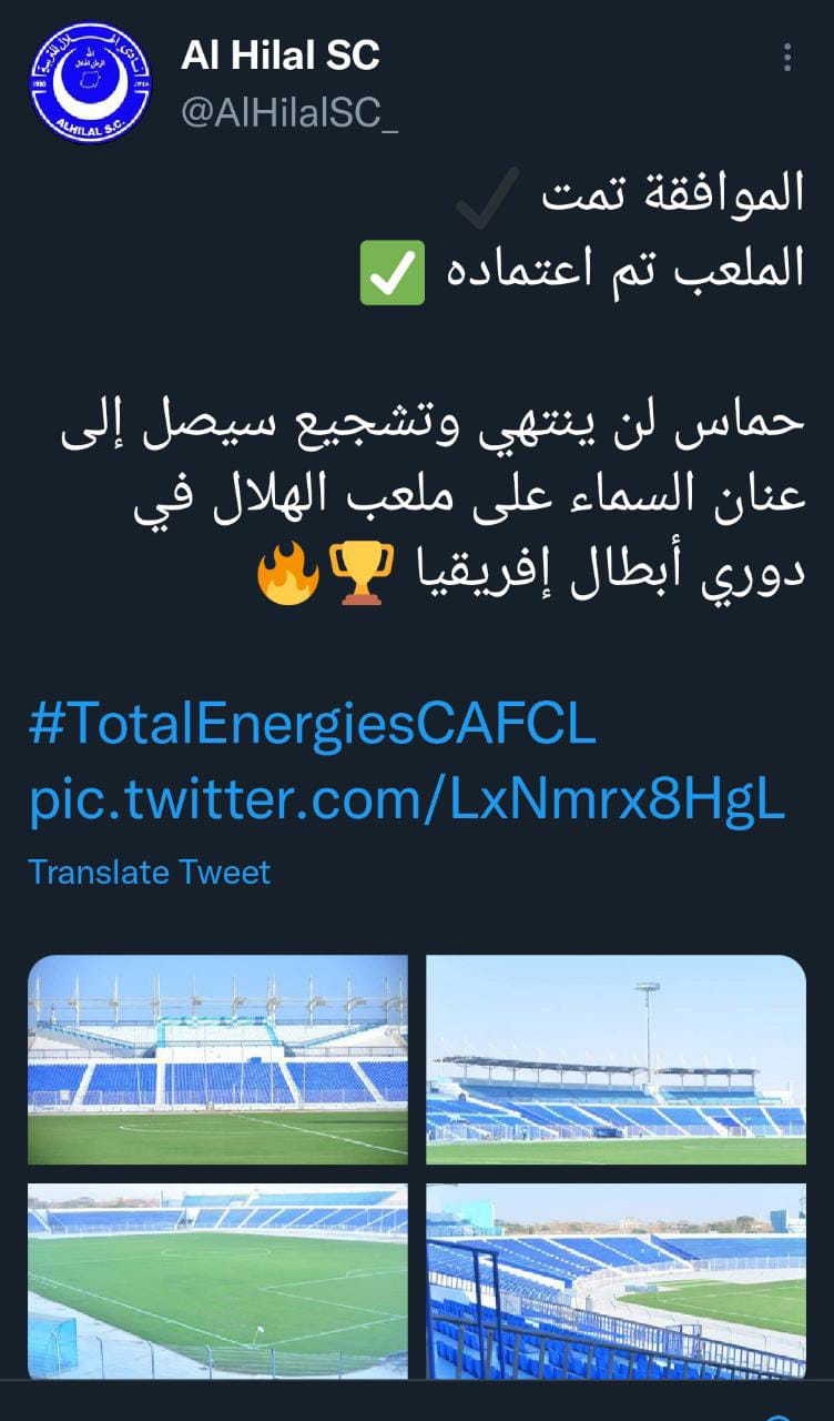 ونشر نادي الهلال بيانا رسميًا، عبر صفحته على موقع التواصل الاجتماعي تويتر: الموافقة تمت، الملعب تم اعتماده، حماس لن ينتهي وتشجيع سيصل إلى عنان السماء على ملعب الهلال في دوري أبطال إفريقيا.