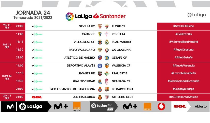 أعلن الاتحاد الإسباني لـ كرة القدم عبر حسابه الرسمي على موقع التواصل الاجتماعي تويتر، مواعيد منافسات الجولة الـ 24 في مسابقة الدوري الإسباني الموسم الكروي 2021-2022.