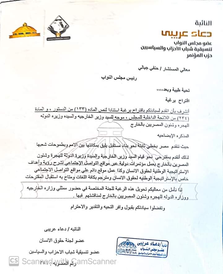 تقدمت النائبة دعاء عريبي، عضو مجلس النواب، عن تنسيقية شباب الأحزاب السياسيين، باقتراح برغبة، موجه إلى وزير الخارجية، سامح شكري، والسفيرة نبيلة مكرم، وزيرة الدولة للهجرة، وشؤون المصريين بالخارج.