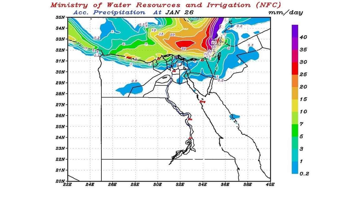 وأضاف المركز، أنه يوم الأربعاء الموافق 26 يناير 2022، تتعرض مناطق من السواحل الشمالية لسقوط أمطار غزيرة تصل إلى 25 مم وتتعرض مناطق من محافظات الوجه البحري، وسيناء لسقوط أمطار خفيفة إلى متوسطة تتراوح من 1-10 مم، وقد تصل إلى أجزاء من القاهرة وشمال الصعيد.
