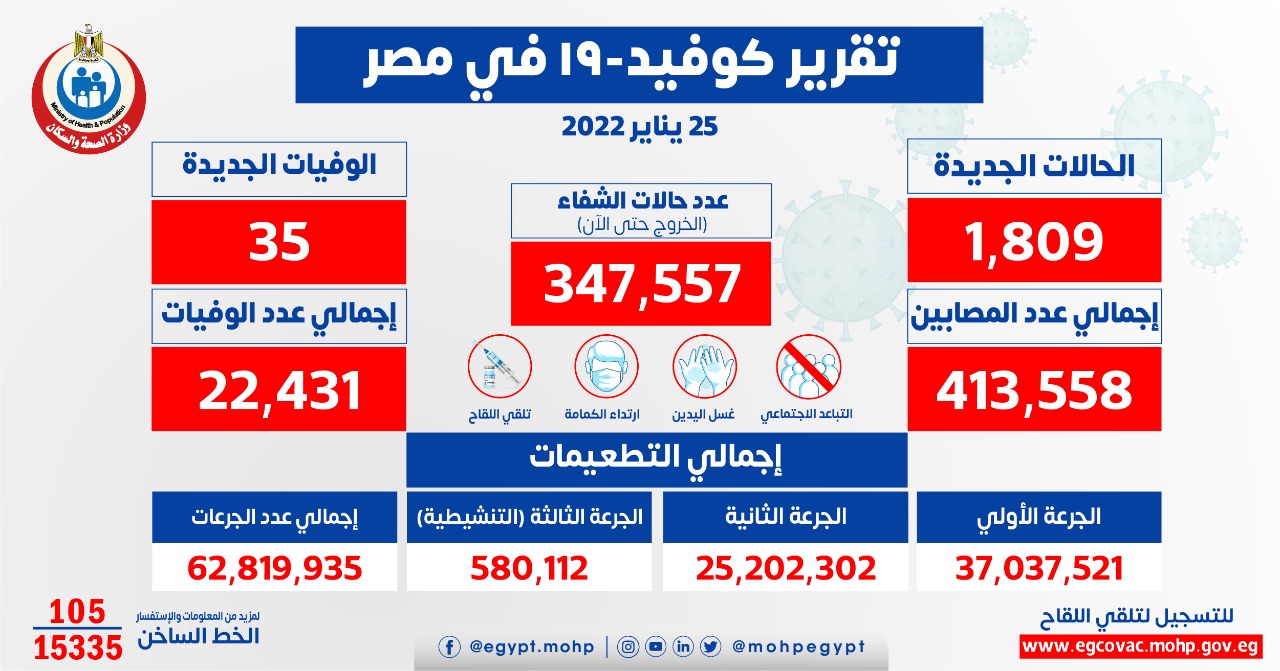 وأوضح الدكتور حسام عبد الغفار المتحدث الرسمي لوزارة الصحة والسكان، أنه تم تسجيل 1809 حالة جديدة ثبتت إيجابية تحاليلها لفيروس كورونا ومتحوراته، وذلك ضمن إجراءات الترصد والتقصي والفحوصات اللازمة التي تُجريها الوزارة وفقًا لإرشادات منظمة الصحة العالمية، لافتًا إلى وفاة 35 حالة جديدة.