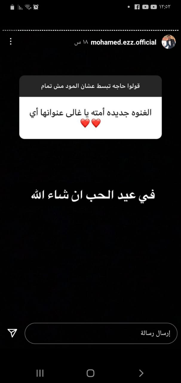 كشف الفنان محمد عز، موعد طرح أغنيته الجديدة عبر خاصية الأسك على حسابه الشخصي بـ إنستجرام.