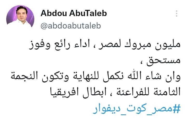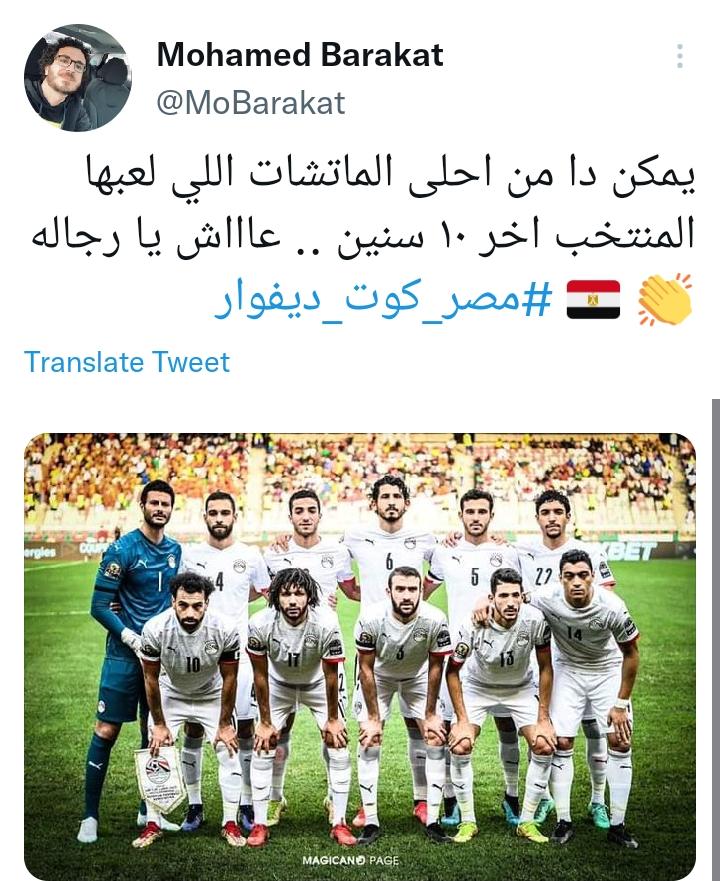 وقال محمود بركات: يمكن ده من أحلى الماتشات اللي لعبها المنتخب آخر 10 سنين، عاش يا رجالة، فيما علق حساب آخر: مليون مبروك لمصر، أداء رائع وفوز مستحق، وإن شاء الله نكمل للنهاية وتكون النجمة الثامنة للفراعنة، أبطال إفريقيا.