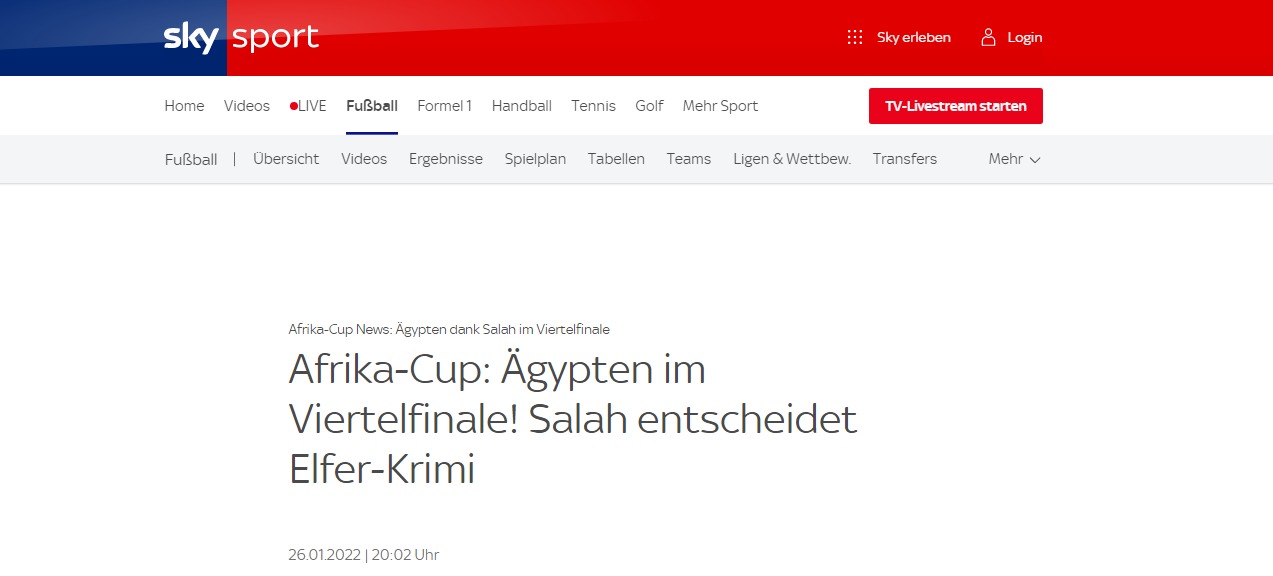 تصدر العنوان "مصر إلى ربع نهائي كأس الأمم الإفريقية.. صلاح يحسم القصة المثيرة" على تقرير شبكة سكاي سبورتس عن مباراة مصر أمام كوت ديفوار، بعد أن سجل صلاح الركلة الحاسمة أمام كوت ديفوار.