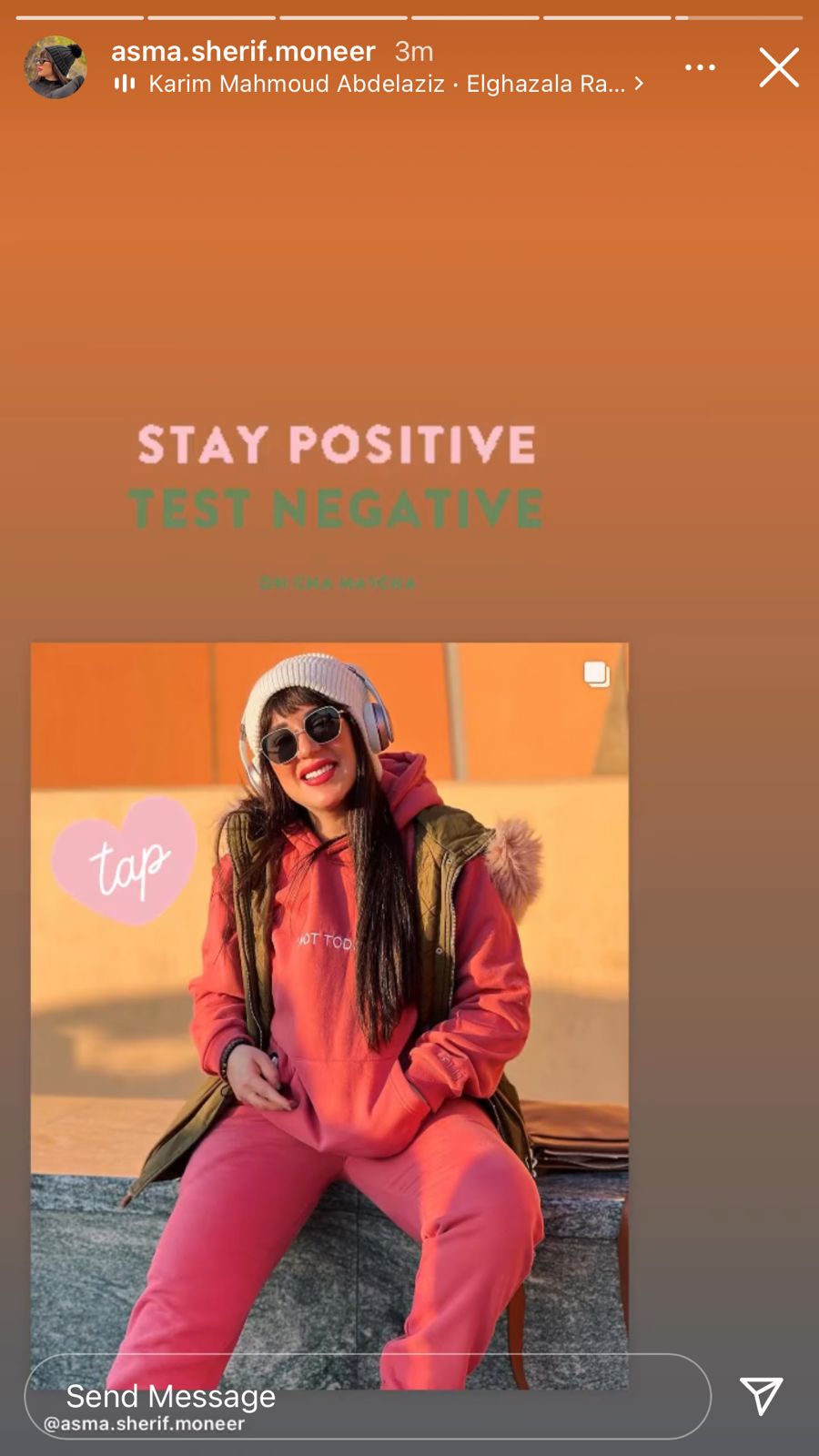 ونشرت أسما شريف منير صورة لها عبر حسابها الرسمي على موقع تبادل الصور والفيديوهات انستجرام، وعلقت قائلة: سلبي كورونا.