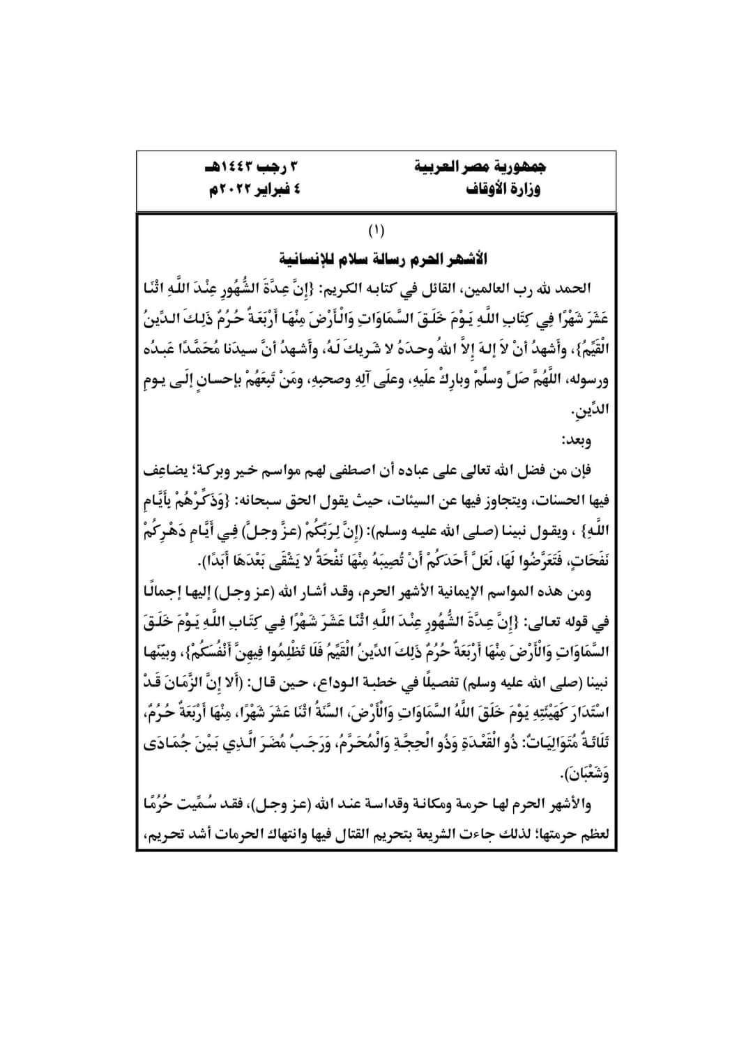 وقال الدكتور محمد مختار جمعة وزير الأوقاف، عبر صفحته الرسمية على موقع التواصل الاجتماعي فيس بوك: يسرنا أن ننشر موضوع خطبة الجمعة القادمة 3 من رجب 1443هـ الموافق 4 فبراير 2022م بعنوان: الأشهر الحرم رسالة سلام للإنسانية.