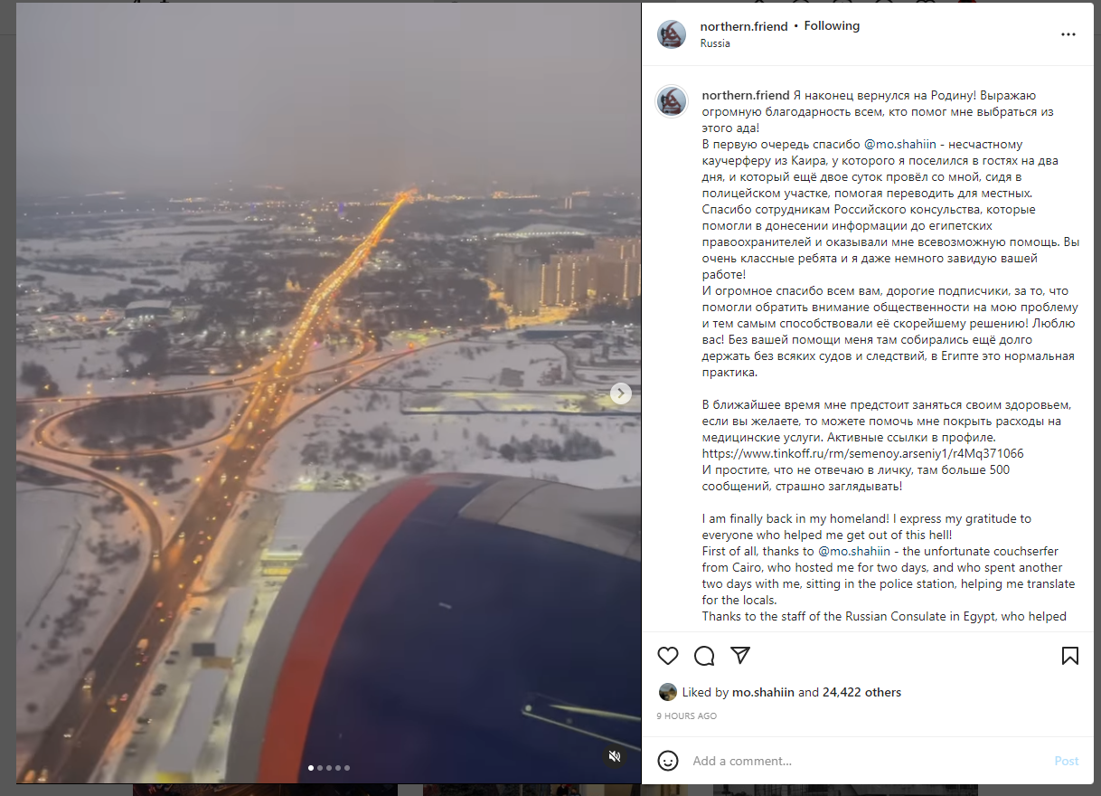 وعاد أرسيني كوتيف إلى روسيا صباح اليوم، ونشر مجموعة من الصور له، على موقع انستجرام لتوثيق لحظة وصوله إلى وطنه روسيا صباح اليوم.