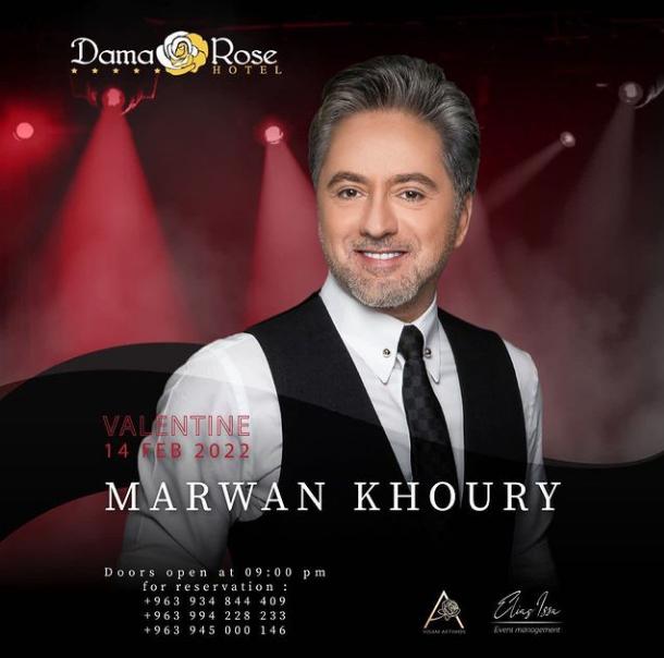 ويقام حفل مروان خوري داخل أحد الفنادق الكبرى بدمشق عاصمة الجمهورية العربية السورية، ويعد هذا الحفل له في دولة سوريا بعد غياب دام لسنوات.