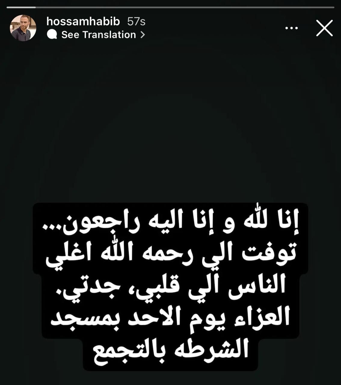 وكتب حسام حبيب عبر خاصية ستوري على حسابه الرسمي على موقع تبادل الصور والفيديوهات انستجرام: إنا لله وإنا إليه راجعون.. انتقلت إلى رحمة الله جدتي الغالية والعزيزة إلى قلبي، والعزاء يوم الأحد بمسجد الشرطة في التجمع.