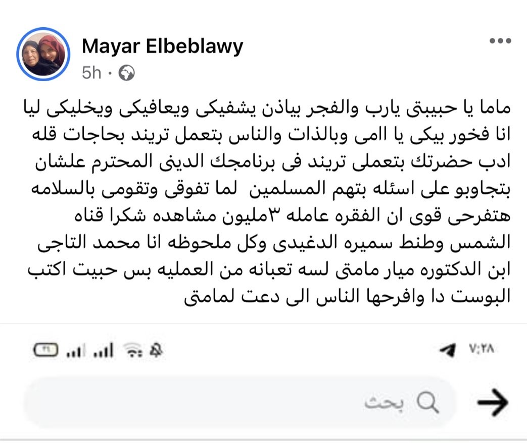 وكتب نجل ميار الببلاوي على حسابها الشخصي بموقع التواصل الاجتماعي فيسبوك: ماما يا حبيبتي يارب والفجر بيأذن يشفيكى ويعافيكى ويخليكى ليا أنا فخور بيكى يا أمي وبالذات والناس بتعمل تريند بحاجات قله أدب حضرتك بتعملى تريند فى برنامجك الديني المحترم علشان بتجاوبوا على أسئلة بتهم المسلمين لما تفوقي وتقومي بالسلامي هتفرحي قوي أن الفقرة عامله 3 مليون مشاهدة.