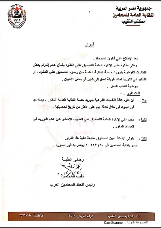 وتضمن القرار؛ بعد الاطلاع على قانون المحاماة، وعلى مذكرة مدير الإدارة العامة للتصديق على العقود بشأن عدم التزام بعض النقابات الفرعية بتوريد حصة النقابة العامة من رسوم التصديق على العقود، أو التأخير في التوريد لمدد طويلة؛ تصل إلى شهر في بعض الأحيان.