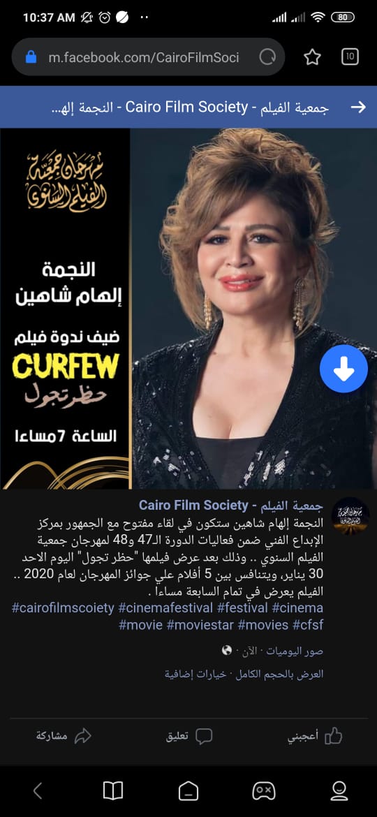 تحرص الفنانة إلهام شاهين، على حضور ندوة فيلم حظر تجول؛ التي من المقرر إقامتها اليوم الأحد 30 يناير، ضمن فعاليات مهرجان جمعية الفيلم في دورته الـ 47 و48.