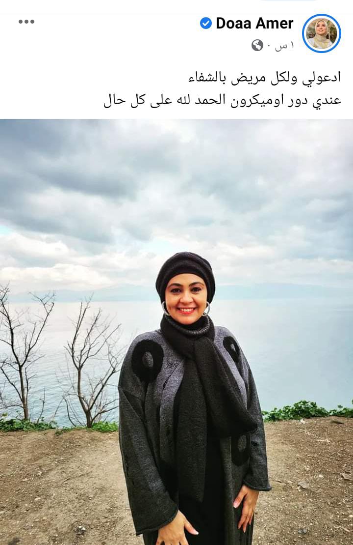 ونشرت دعاء عامر، صورة لها عبر حسابها الشخصي على فيسبوك، وعلقت عليها: ادعولي بالشفاء.. عندي دور أوميكرون.. الحمد الله.