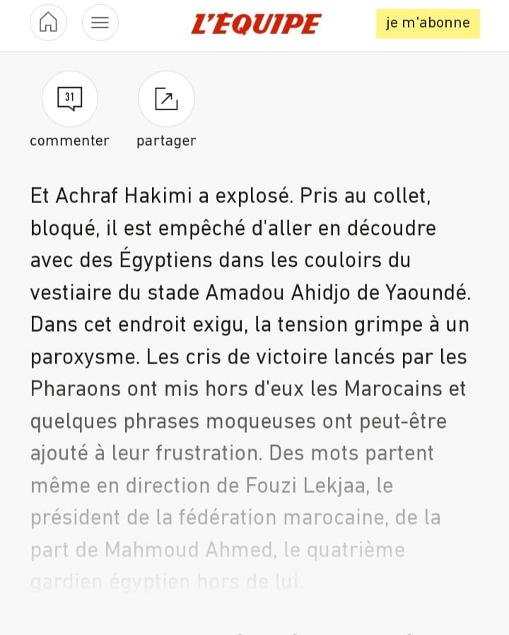 وأكدت صحيفة "ليكيب" الفرنسية"، إن سبب الفوضى التي كانت بعد مباراة مصر والمغرب في ممر الملعب، حيث نشبت أزمة بسبب احتفالات لاعبي منتخب مصر التي استفزت لاعبي منتخب المغرب.