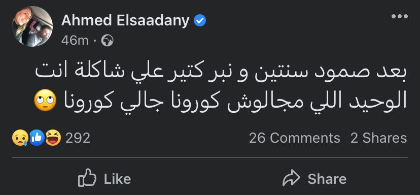 ونشر أحمد السعدني، منشورًا عبر حسابه الشخصي بموقع التواصل الاجتماعي فيسبوك، قائلًا: بعد صمود سنتين ونبر كتير على شاكلة أنت الوحيد اللي مجالوش كورونا.. جالي كورونا.