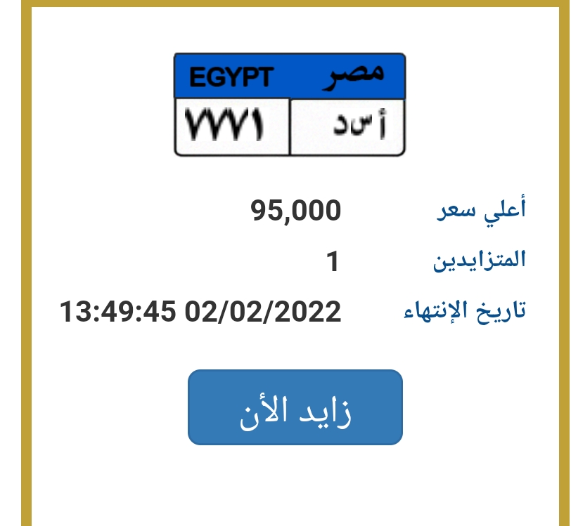 يتيح الموقع لوحة تحمل اسم أسد 7771، ويبدأ التزايد عليها من مبلغ 95 ألف جنيه مصري، بينما بلغ عدد المتزايدين على تلك اللوحة حتى الآن شخص واحد، وينتهي التزايد عليها في تاريخ 2 فبراير المقبل.