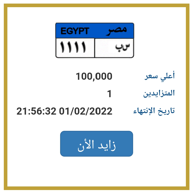 كما أتاح الموقع لوحات السيارات المميزة في مصر، ومن بينها لوحة معدنية س ب 1111، وبلغ سعرها حتى الآن 100 ألف جنيه، مع العلم أن عدد المتزايدين عليها شخص واحد، ومن المفترض انتهاء التزايد عليها في يوم الثلاثاء الموافق 1 من نوفمبر المقبل.