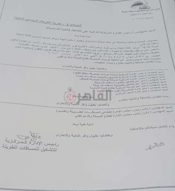 وتضمن المستند عددًا المحطات المقرر توقف القطار بها وهي: الجيزة -الواسطى - بني سويف - مغاغة - بني مزار -المنيا - ملوي - ديروط - القوصية - منفلوط - أسيوط - طما - طهطا - المراغة - سوهاج - جرجا - البلينا - أبو تشت - نجع حمادي - قنا - قوص - الأقصر على أن يتم عودة القطار غدا الأربعاء 1/2/2022، بنفس المحطات المقرر التوقف بها.