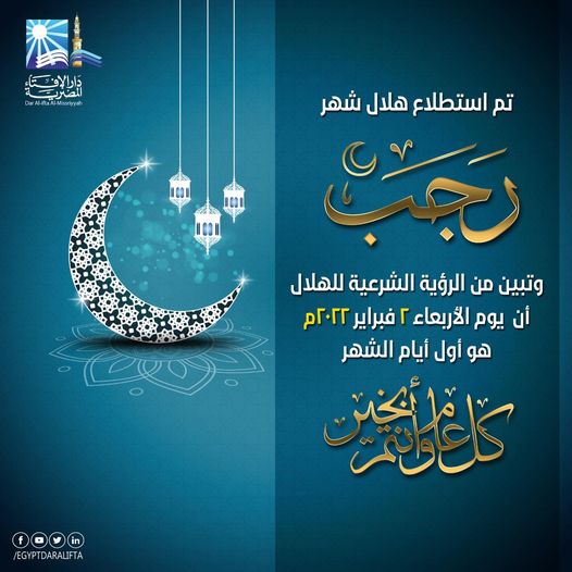 وتابعت الإفتاء: على ذلك تعلن دار الإفتاء المصرية أن يوم الأربعاء الموافق الثاني من شهر فبراير لعام ألفين واثنين وعشرين ميلاديا، أول أيام شهر رجب لعام ألف وأربعمائة وثلاثة وأربعين هجريًّا.