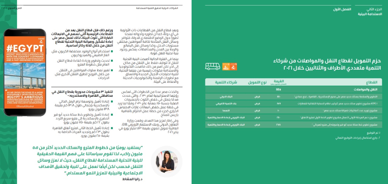 ووقعت أيضًا وزارة التعاون الدولي تمويل تنموي بقيمة 240 مليون دولار من البنك الأوروبي لإعادة الإعمار والتنمية لتنفيذ مشروع دعم المرحلة الأولى لأعمال تطوير الخط الأول لمترو الأنفاق، وكذلك تمويل بقيمة 278 مليون دولار لتنفيذ مشروع تطوير خط سكة حديد أبو قير وتحويله إلى مترو كهربائي.
