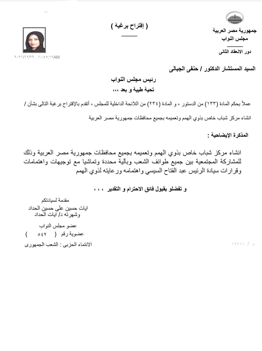 تقدمت الدكتورة آيات الحداد، عضو مجلس النواب، عن حزب الشعب الجمهوري، بطلب إحاطة موجه إلى المستشار الدكتور حنفي جبالي، وذلك بشأن إنشاء مركز شباب خاص بذوي الهمم، وتعميمه بجميع محافظات الجمهورية، وذلك للمشاركة المجتمعية بين جميع طوائف الشعب وبآلية محددة وتماشيا مع توجيهات واهتمامات وقرارات الرئيس عبد الفتاح السيسي واهتمامه ورعايته لذوي الهمم.