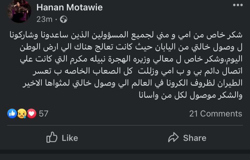 وكتبت حنان مطاوع، منشورًا عبر حسابها الشخصي بموقع التواصل الاجتماعي فيسبوك، قائلة: شكر خاص من أمي ومني لجميع المسؤولين الذين ساعدونا وشاركونا لوصول خالتي من اليابان، حيث كانت تعالج هناك إلى أرض الوطن.