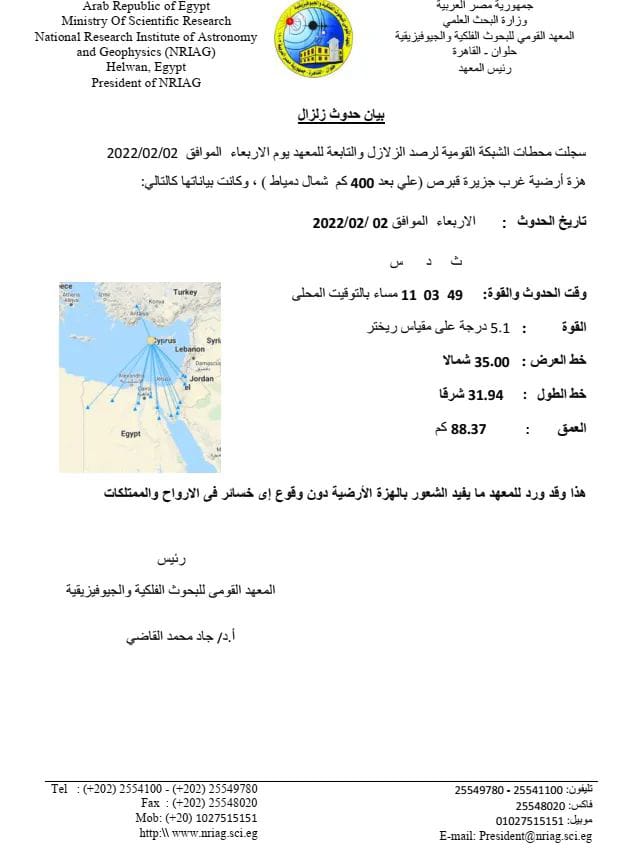 وقال رئيس المعهد القومي للبحوث الفلكية، إنه بخصوص ما كتبته بعض المواقع عن زلزال قبرص منذ قليل، متابعا أن الزلزال بعيد جدا ولم يشعر به احد من المواطنين.