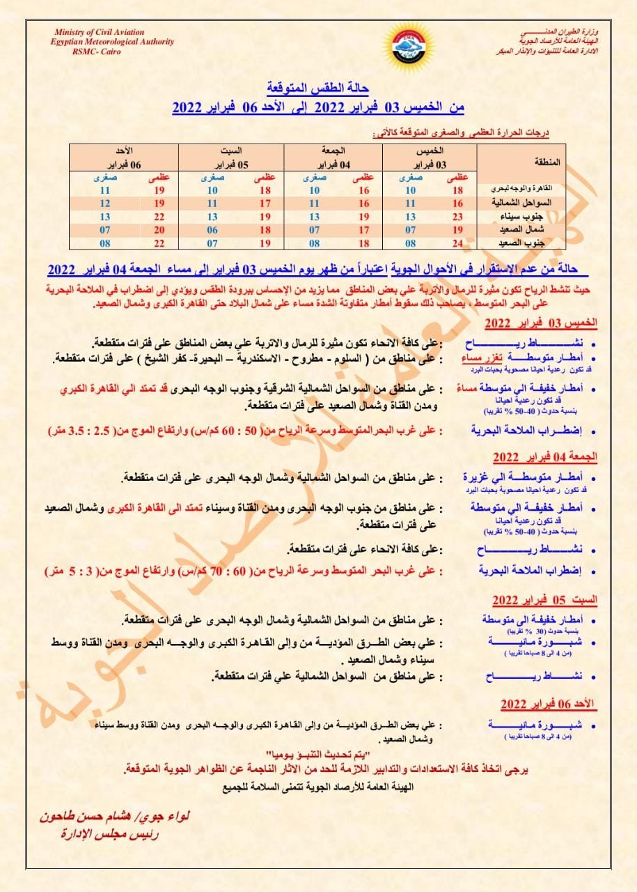كما تنبأت الهيئة العامة للأرصاد الجوية بـ حالة الطقس ودرجات الحرارة المتوقعة من اليوم الخميس، حتى يوم الأحد الموافق 6 فبراير؛ سيشهد حالة من عدم الاستقرار.
