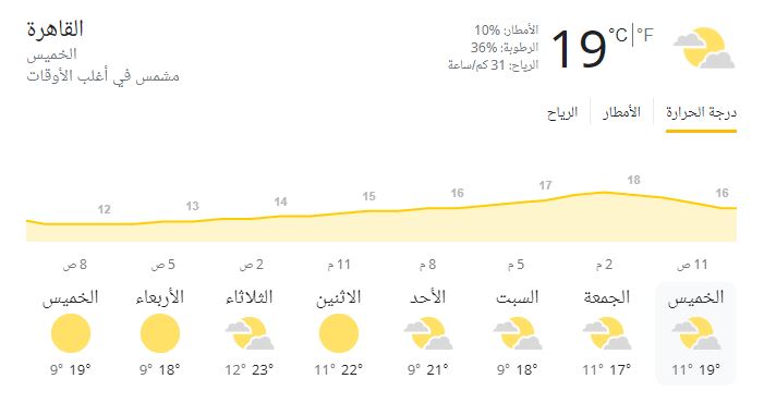 وعن الطقس اليوم في القاهرة الآن مباشر، فقد كشفت خريطة الأرصاد الجوية على "جوجل" أن درجة الحرارة في القاهرة مشمس أغلب الوقت، حيث تسجل في تمام الساعة الـ 11 صباحا نحو 19 درجة مئوية، أما بالنسبة للأمطار فقد تصل نسبة سقوطها إلى 10%، وتصل درجة الرطوبة الآن 36%.