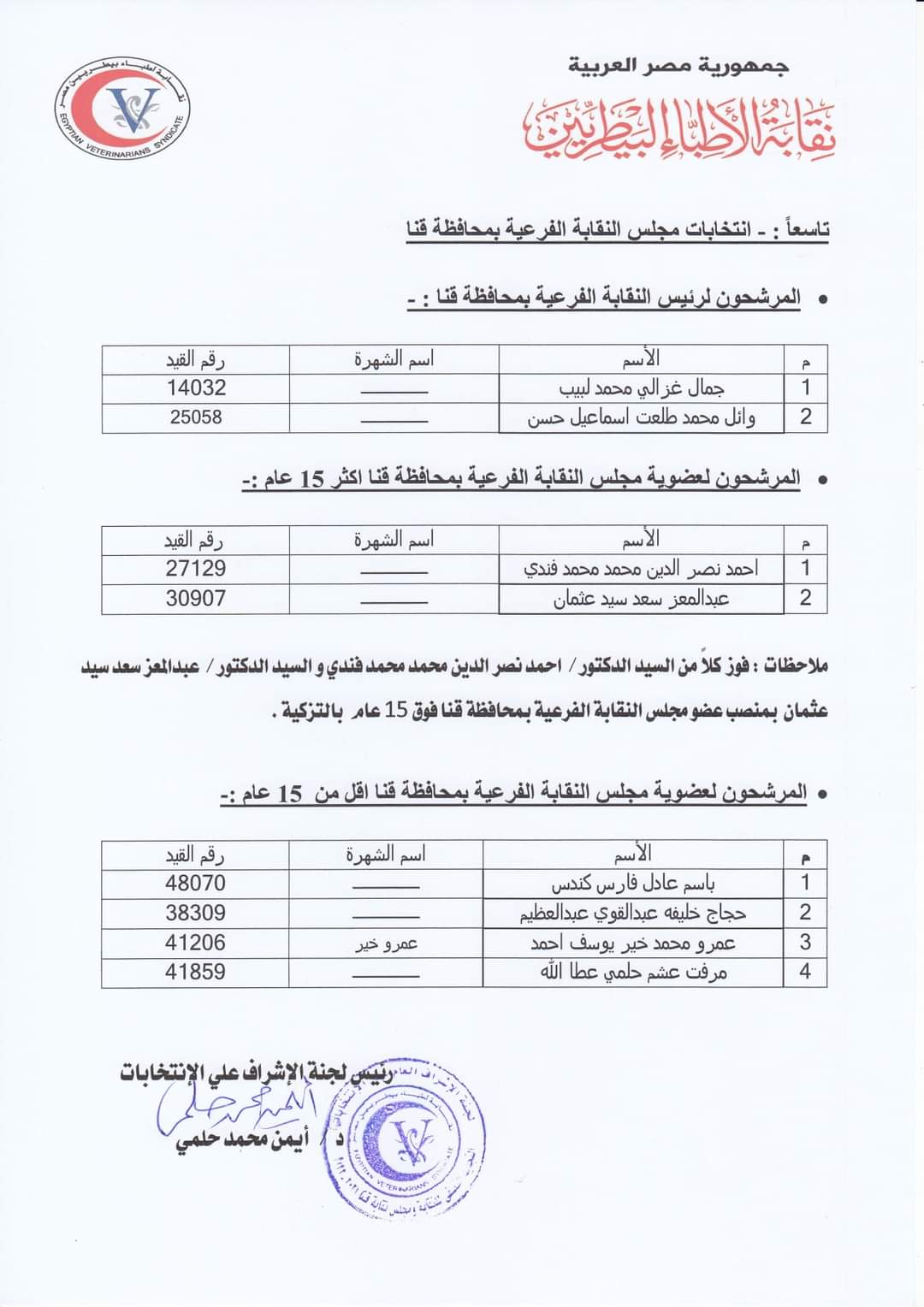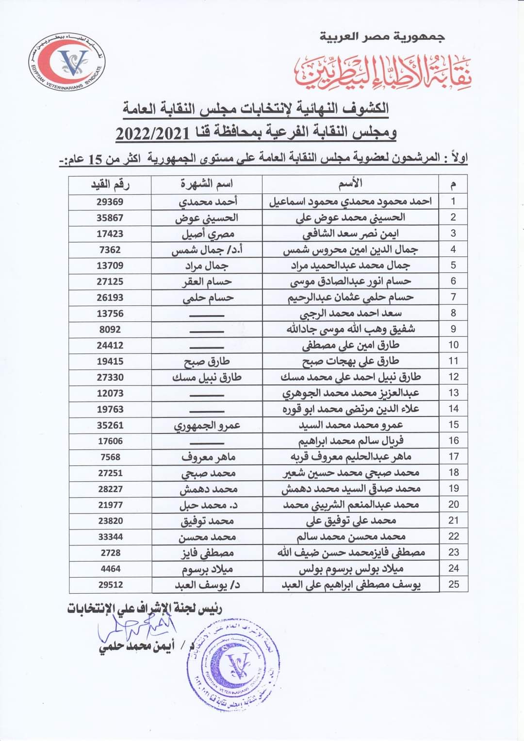 كشفت النقابة العامة للأطباء البيطريين متمثلة في لجنة الإشراف على انتخابات التجديد النصفي للنقابة العامة ونقابة قنا الفرعية 2022عن الكشوف النهائية لأسماء المرشحين على مقاعد النقابة العامة ومجلس نقابة قنا الفرعية.