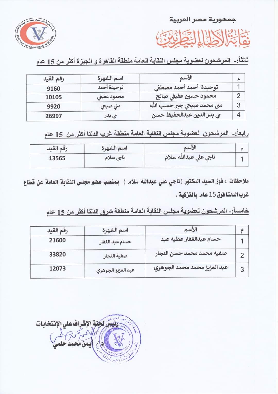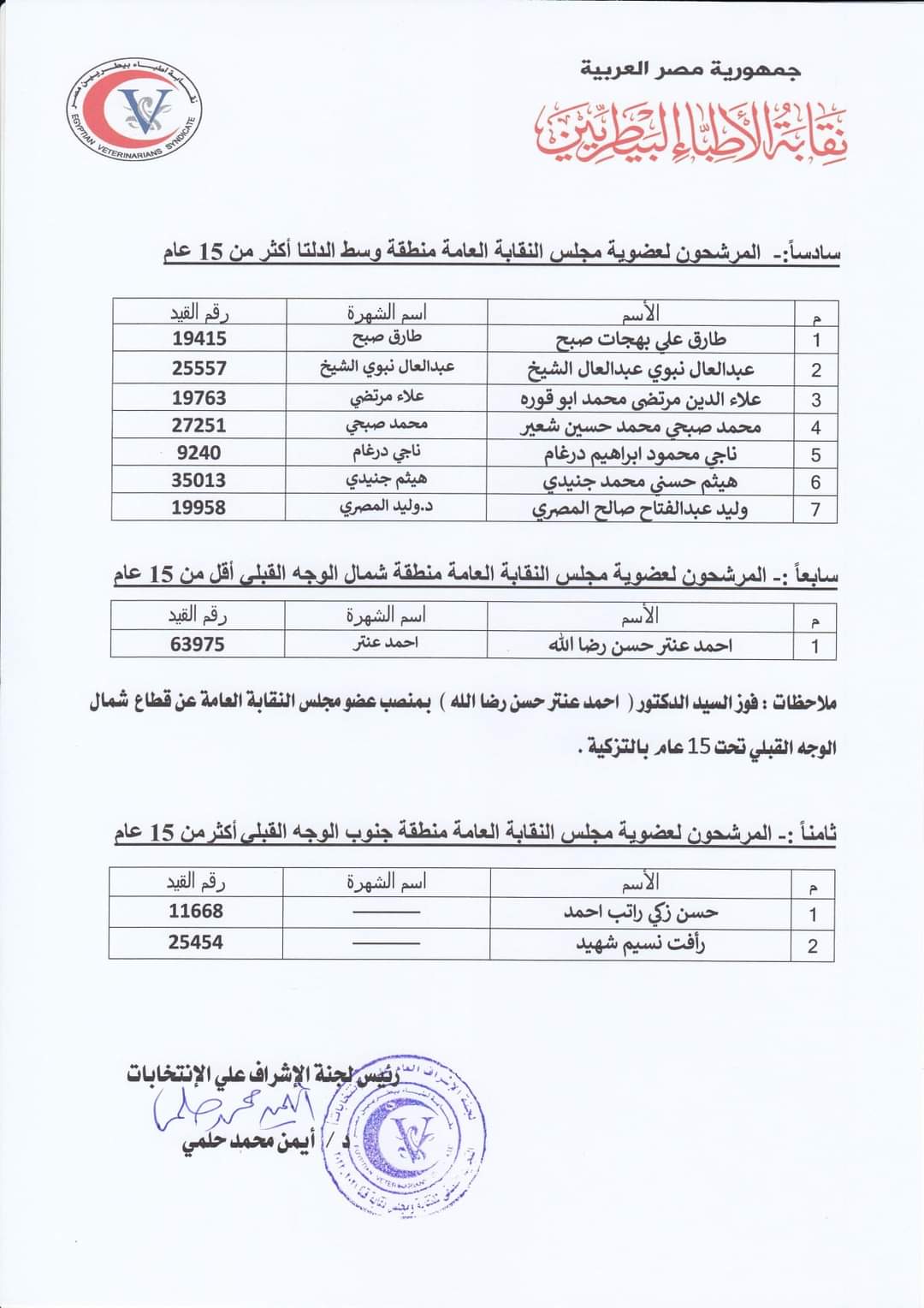 البيطريين تعلن أسماء المرشحين على مقاعد انتخابات التجديد النصفي