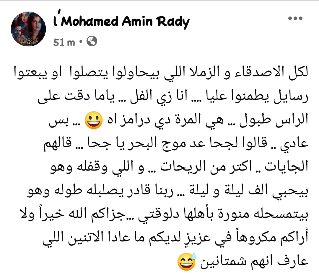 وواصل: واللي وقفله وهو بيحبي ألف ليلة وليلة، ربنا قادر يصلبله طوله هو بيتمسحله منورة بأهلها دلوقتي، جزاكم الله خيرا ولا أراكم مكروها في عزيز لكم.. ما عدا الاتنين اللي عارف أنهم شمتانين.