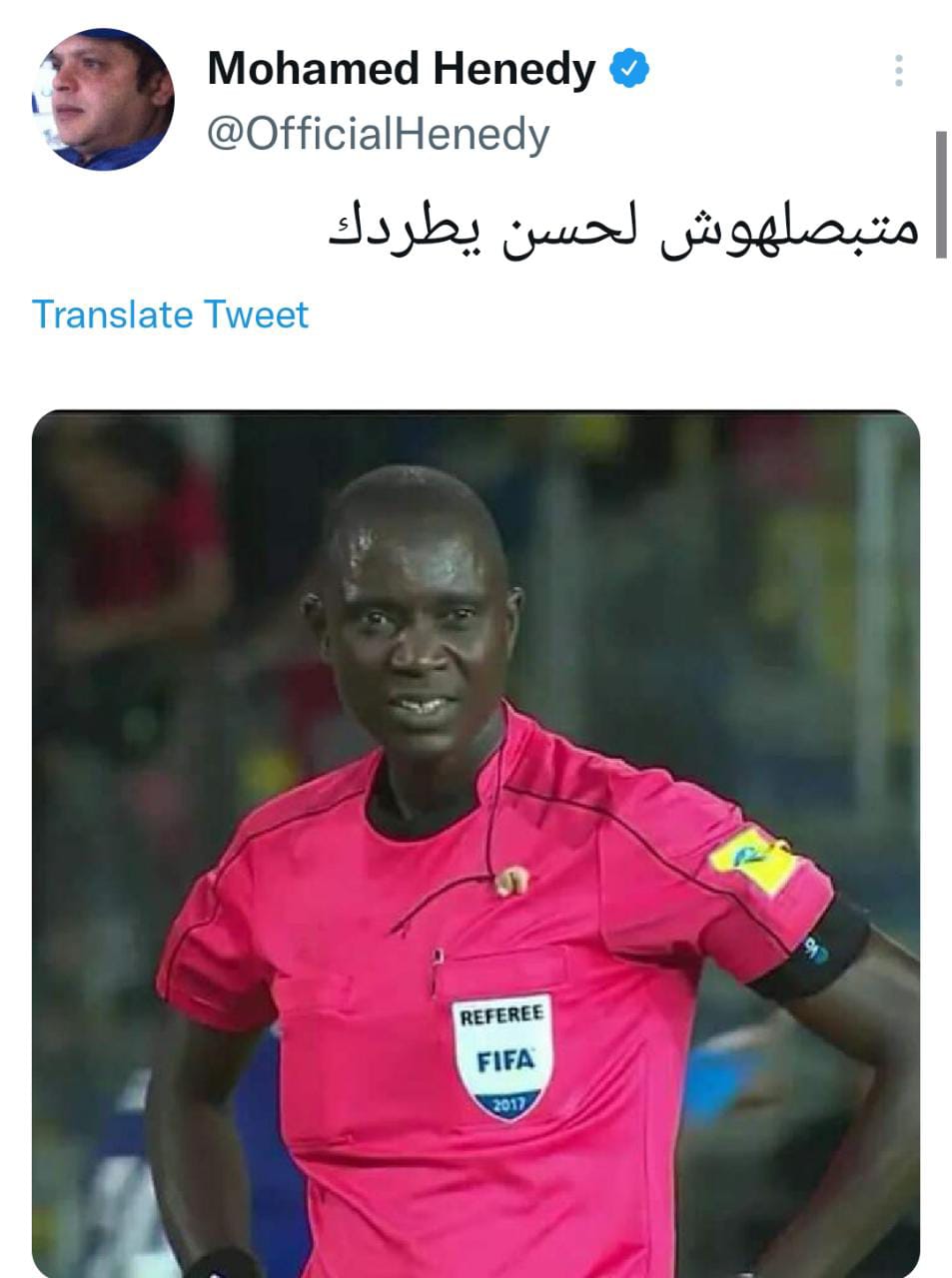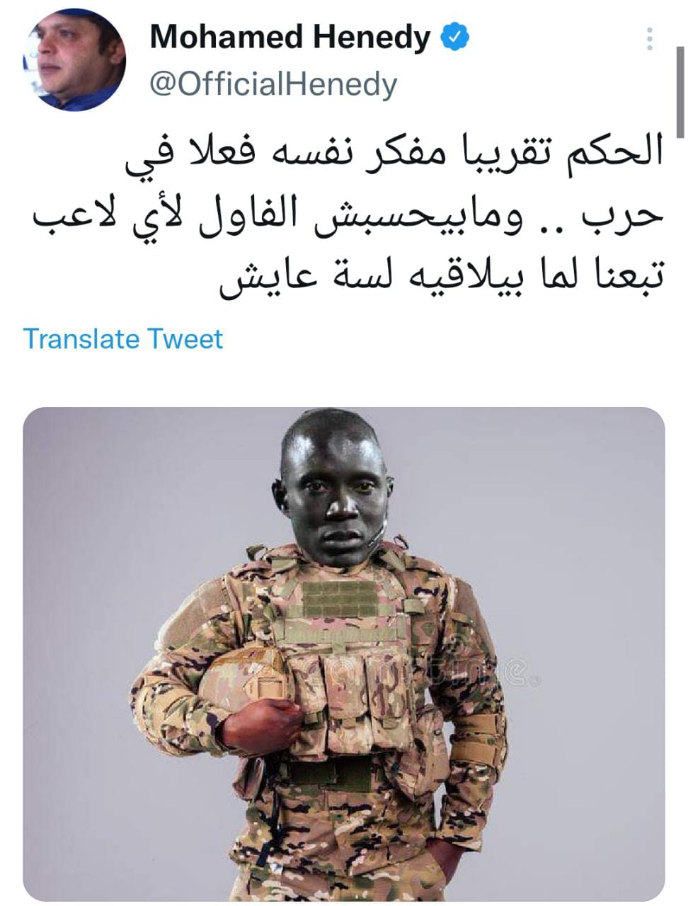 كما نشر هنيدي، صورة ساخرة من حكم مباراة مصر والكاميرون، وعلق عليها: الحكم تقريبا مفكر نفسه فعلا في حرب.. ومابيحسبش الفاول لأي لاعب تبعنا؛ لما يلاقيه لسه عايش.