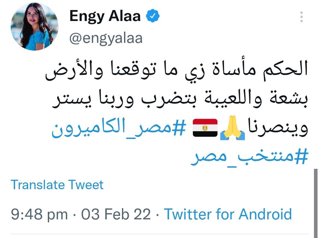 وانتقدت إنجي علاء، أداء حكم مباراة مصر والكاميرون، عبر حسابها الرسمي على موقع التغريدات القصيرة تويتر، حيث كتبت: الحكم مأساة زي ما توقعنا، والأرض بشعة، واللعيبة بتضرب، وربنا يستر وينصرنا.