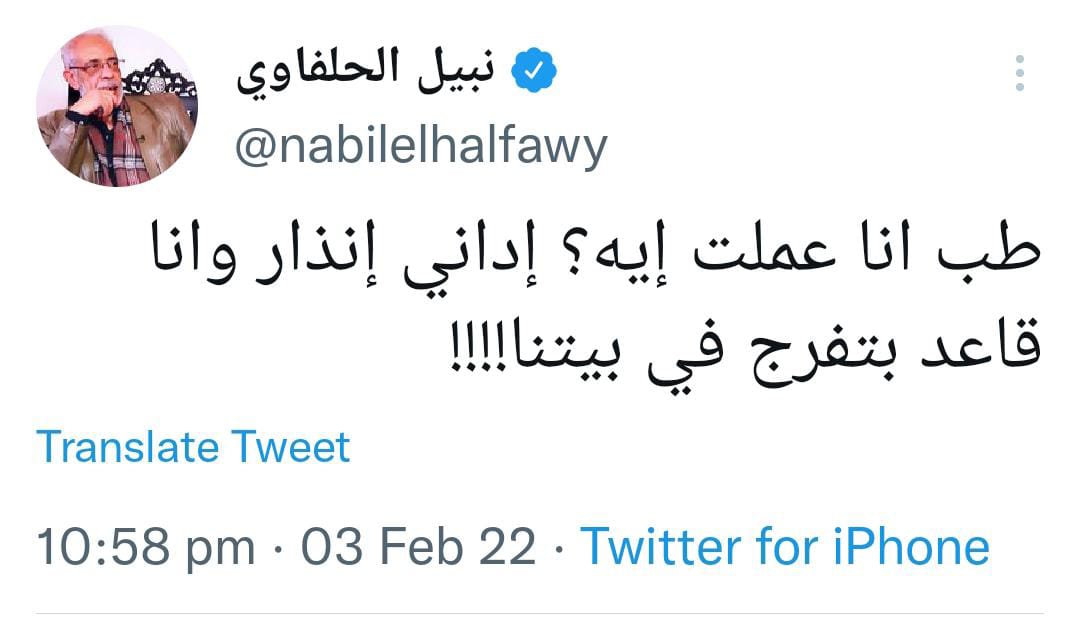 وعلق الفنان نبيل الحلفاوي، على حكم مباراة مصر والكاميرون، حيث كتب عبر حسابه الرسمي على موقع التغريدات القصيرة تويتر: طب أنا عملت إيه؟ إداني إنذار، وأنا قاعد بتفرج في بيتنا.