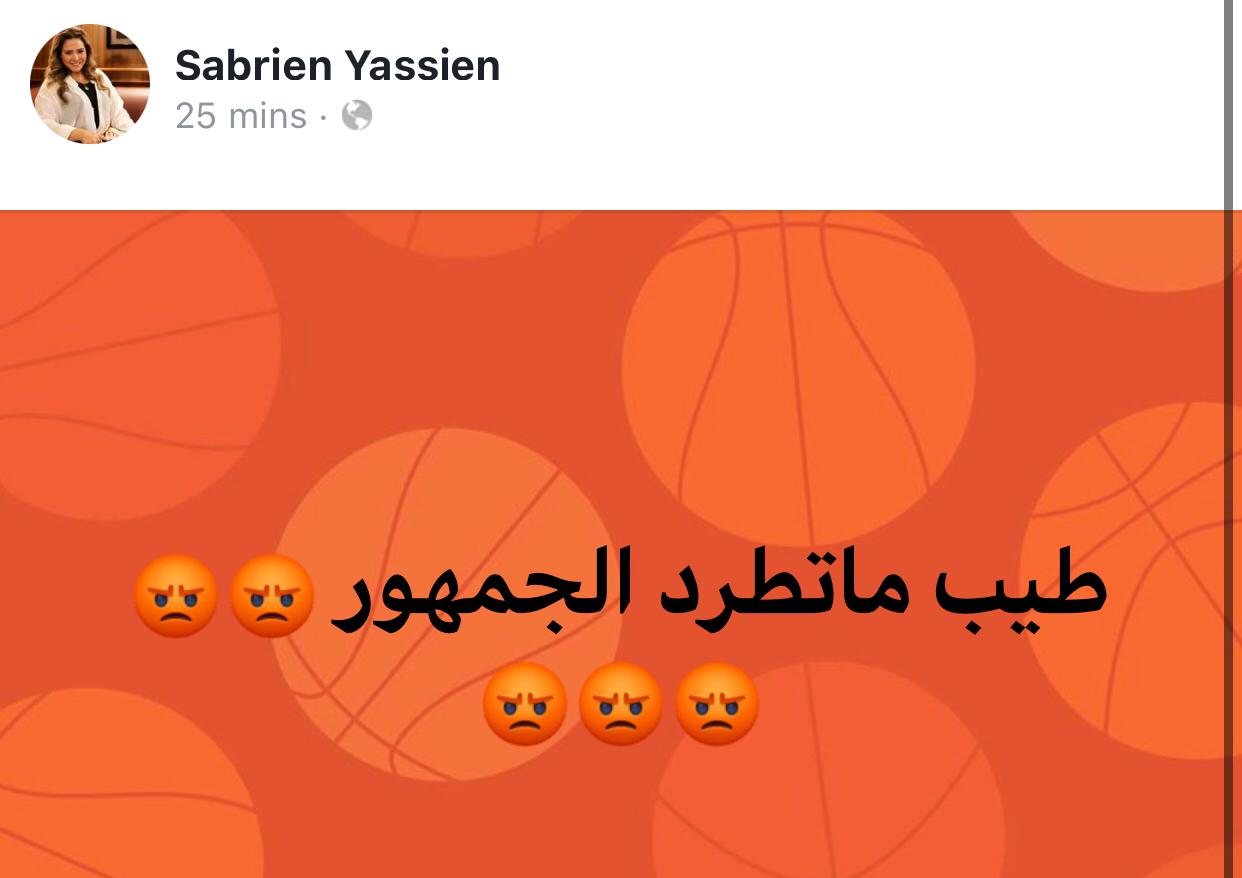 وعبرت الفنانة صابرين، عن غضبها الشديد من أداء حكم مباراة مصر والكاميرون، وكتبت عبر حسابها الرسمي على موقع التواصل الاجتماعي فيسبوك: ما تطرد الجمهور أحسن.
