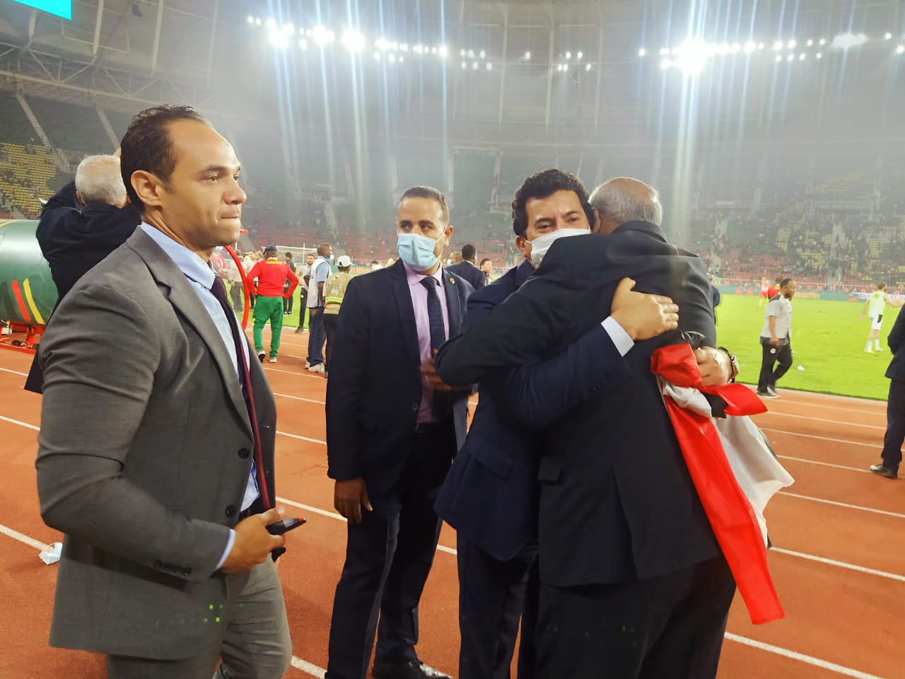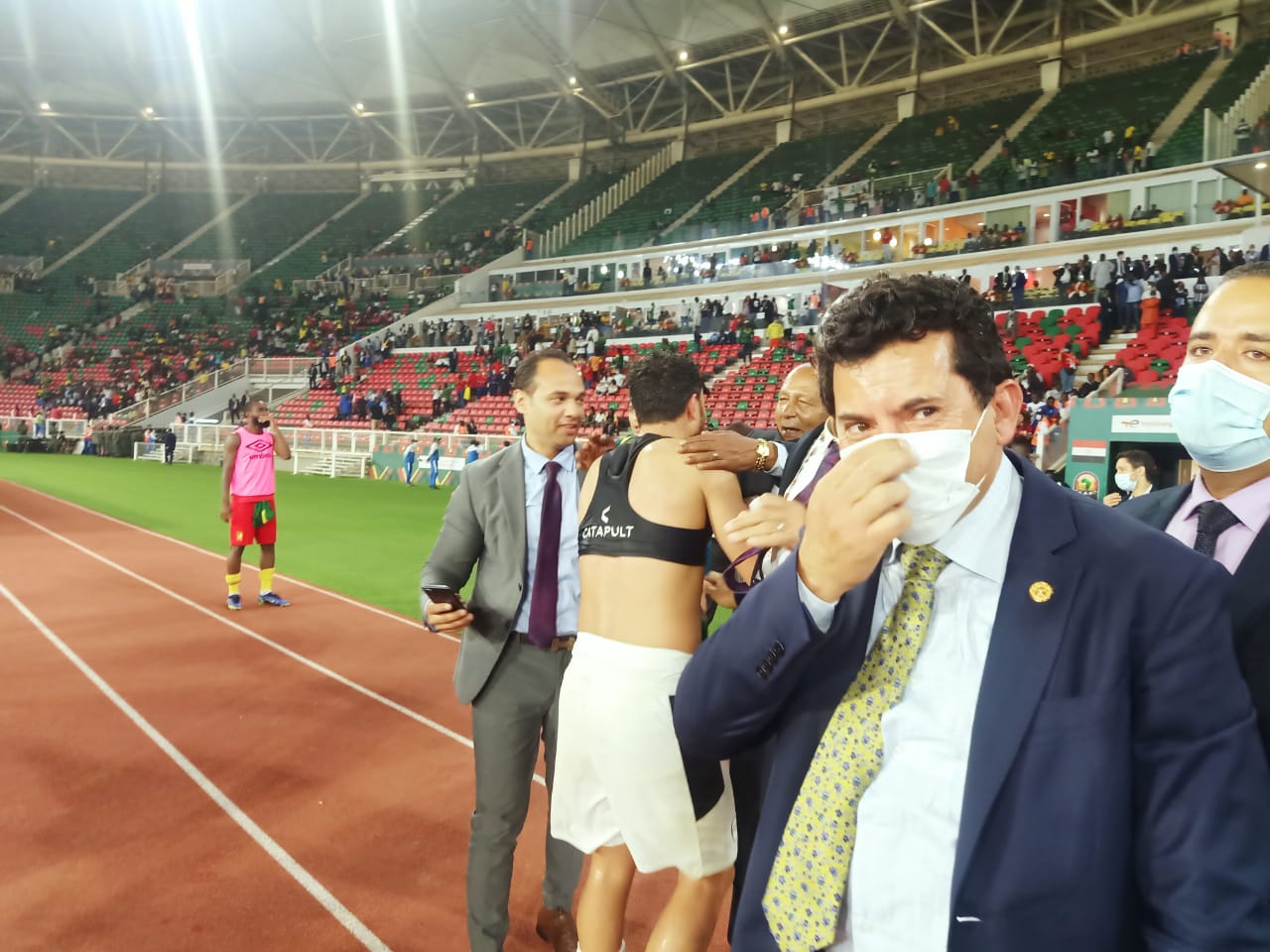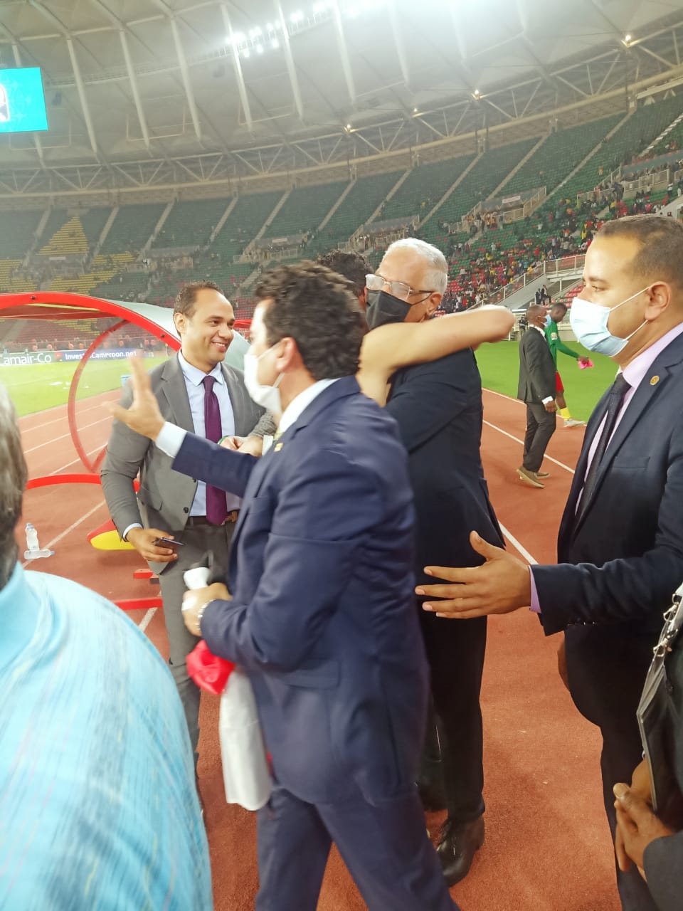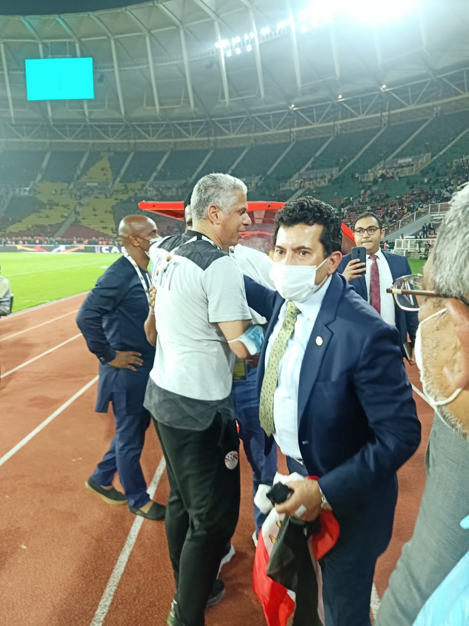 وحرص إيتو على مصافحة الدكتور أشرف صبحي وزير الشباب والرياضة، والذي تواجد هو الآخر في أرضية الملعب لتهنئة الجهاز الفني ولاعبي الفراعنة بالفوز على الأسود الكاميرونية والتأهل إلى نهائي أمم إفريقيا.