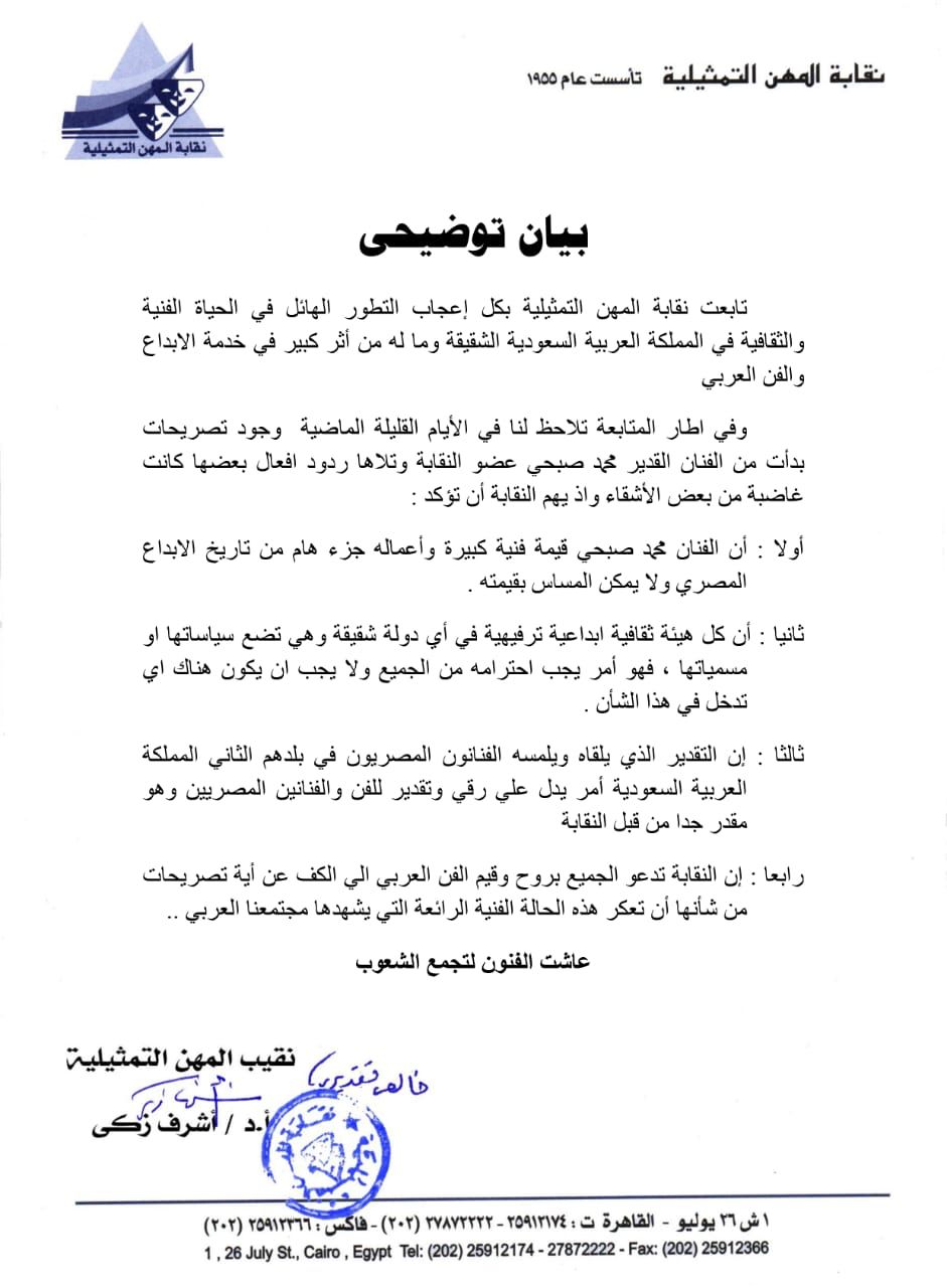 أصدرت نقابة المهن التمثيلية برئاسة أشرف زكي بيانا حول الجدل الذي أثير مؤخرًا بسبب تصريحات النجم الكبير محمد صبحي فيما يتعلق برفض عرض مسرحيته خيبتا في السعودية، مقابل 4 ملايين دولار.