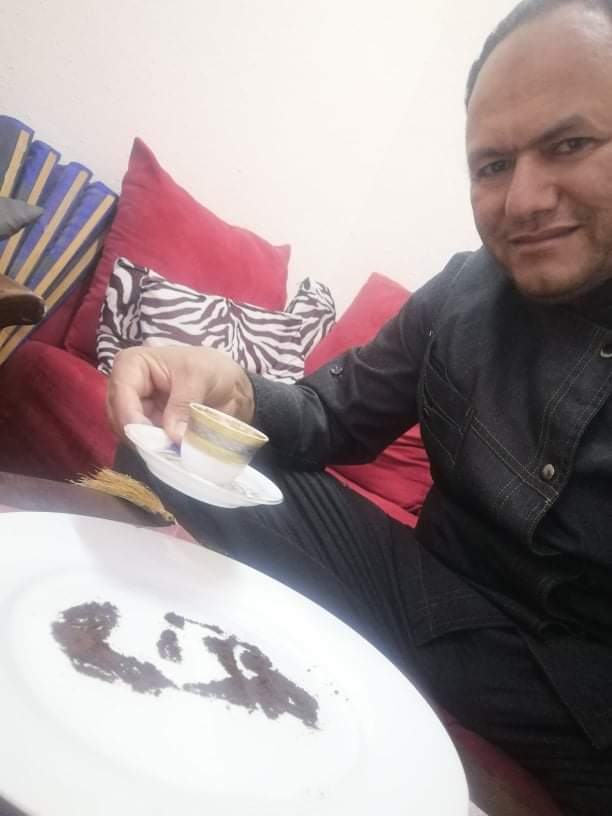 رسم صورة «أبو جبل» مستخدما فرشاة وقهوة مطحونة وطبق أبيض