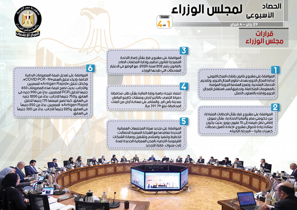 وجاء في التقرير، أنه تم إصدار عدد من القرارات، تشمل قرارًا بالموافقة على مشروع قانون بإنشاء المركز القومي لإدارة المجال الجوي بهدف تطوير المجال الجوي، وتقديم الخدمات الملاحية، وتعزيز السلامة الجوية المؤمنة بالمعلومات المتكاملة، وتحقيق أنسب استغلال للمجال الجوي وإدارته بالأسلوب الأمثل، بالإضافة إلى قرار بالموافقة على مشروع قرار بشأن الخطابات المتبادلة بين حكومتي مصر والمانيا الاتحادية، بشأن تمويل إضافي تصل قيمته إلى 15 مليون يورو، بحيث يكون بمثابة زيادة لأموال مشروع "إعادة تأهيل محطات كهرباء مائية – المرحلة الثانية".