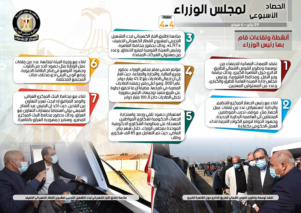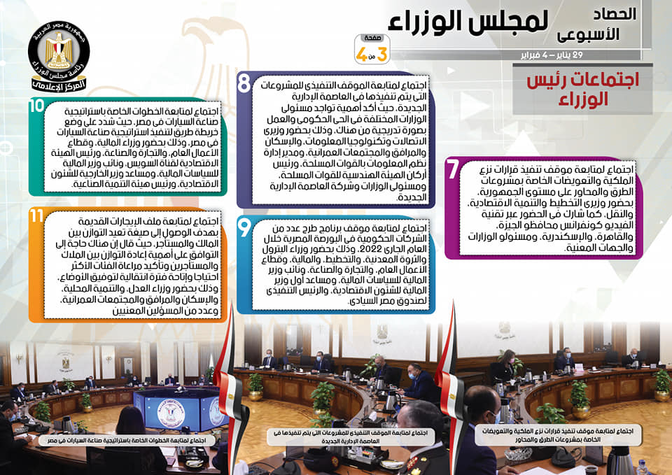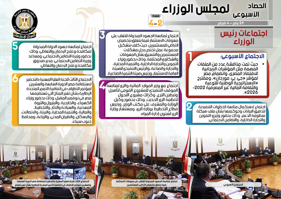 نشر المركز الإعلامي لمجلس الوزراء، تقريرًا شمل إنفوجرافات سلط من خلالها الضوء على الحصاد الأسبوعي، لمجلس الوزراء، وذلك خلال الفترة من 29يناير حتى 4 فبراير 2022، والذي تضمن الموافقة على عدد من القرارات، فضلًا عن الاجتماعات واللقاءات التي عقدها الدكتور مصطفى مدبولي، رئيس مجلس الوزراء، بالإضافة إلى ما قام به سيادته من أنشطة.