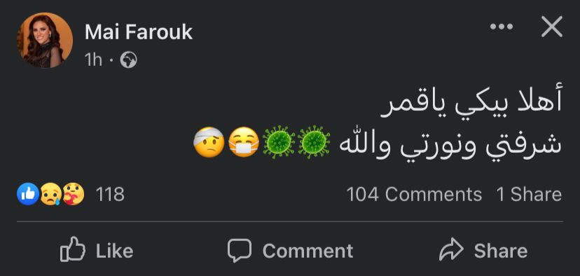 أعلنت الفنانة مي فاروق إصابتها بـ فيروس كورونا، عبر حسابها بموقع التواصل الاجتماعي فيسبوك.