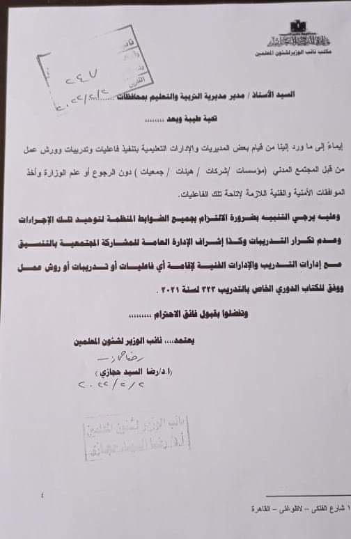 وحصل القاهرة 24، على صورة من إخطار التعليم للمديريات، حيث تضمن التنبيه على المديريات بضرورة الالتزام بجميع الضوابط المنظمة لتوحيـد الإجراءات وعـدم تكرار التدريبات، وكذلك إشراف الإدارة العامة للمشاركة المجتمعية بالتنسيق مـع إدارات التدريب والإدارات الفنية لإقامة أي فاعليات أو تدريبات أو ورش عمل ووفق للكتاب الدوري الخاص بالتدريب 323 لسنة 2021.