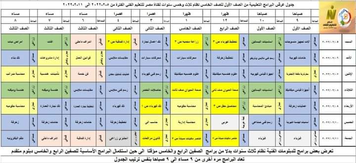 أعلن قطاع التعليم الفني التابع لوزارة التربية والتعليم، جدول عرض البرامج التعليمية من الصف الأول للصف الخامس نظام 5و3 سنوات لقناة مصر للتعليم الفني.