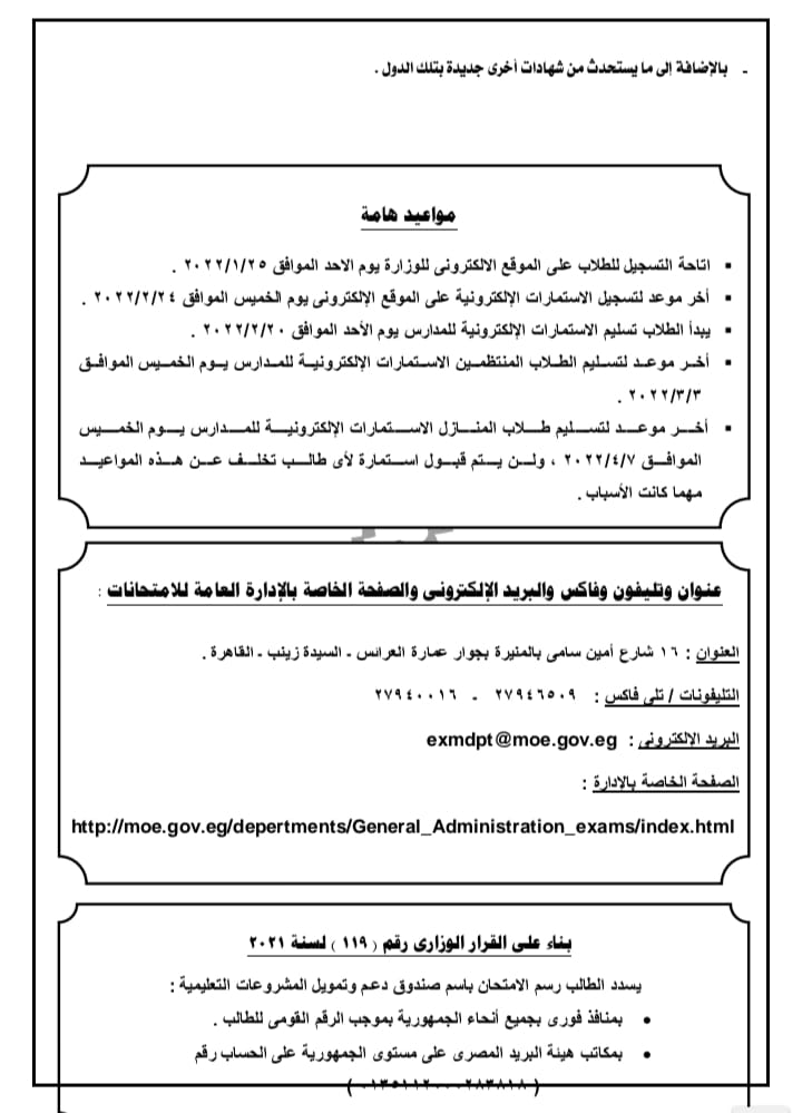 ونص كتاب الإدارة على أنه الوزارة أتاحت التسجيل للطلاب لاستمارات التقدم للامتحانات يوم الأحد 25 يناير الماضي، على أن يكون أخر موعد للتسجيل الخاص بالاستمارات الالكترونية على الموقع الالكتروني الخاص بالوزارة هو 24 فبراير الجاري.