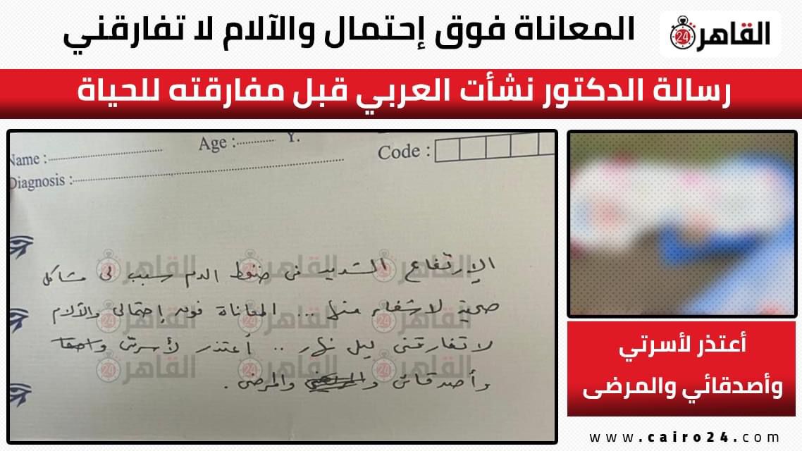 وقال نشأت العربي الطبيب المنتحر، في رسالته، معتذرًا لأسرته وأصدقائه ومرضاه، ممن يترددون على عيادته: الارتفاع الشديد في ضغط الدم سبب لي مشاكل صحية لا شفاء منها.