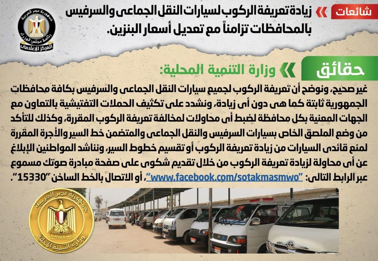 وأكدت وزارة التنمية المحلية، أنه لا صحة لزيادة تعريفة الركوب لسيارات النقل الجماعي والسرفيس بالمحافظات تزامنًا مع تعديل أسعار البنزين، مُوضحةً أن تعريفة الركوب لجميع سيارات النقل الجماعي والسرفيس بكافة محافظات الجمهورية ثابتة كما هي دون أي زيادة.