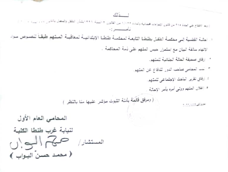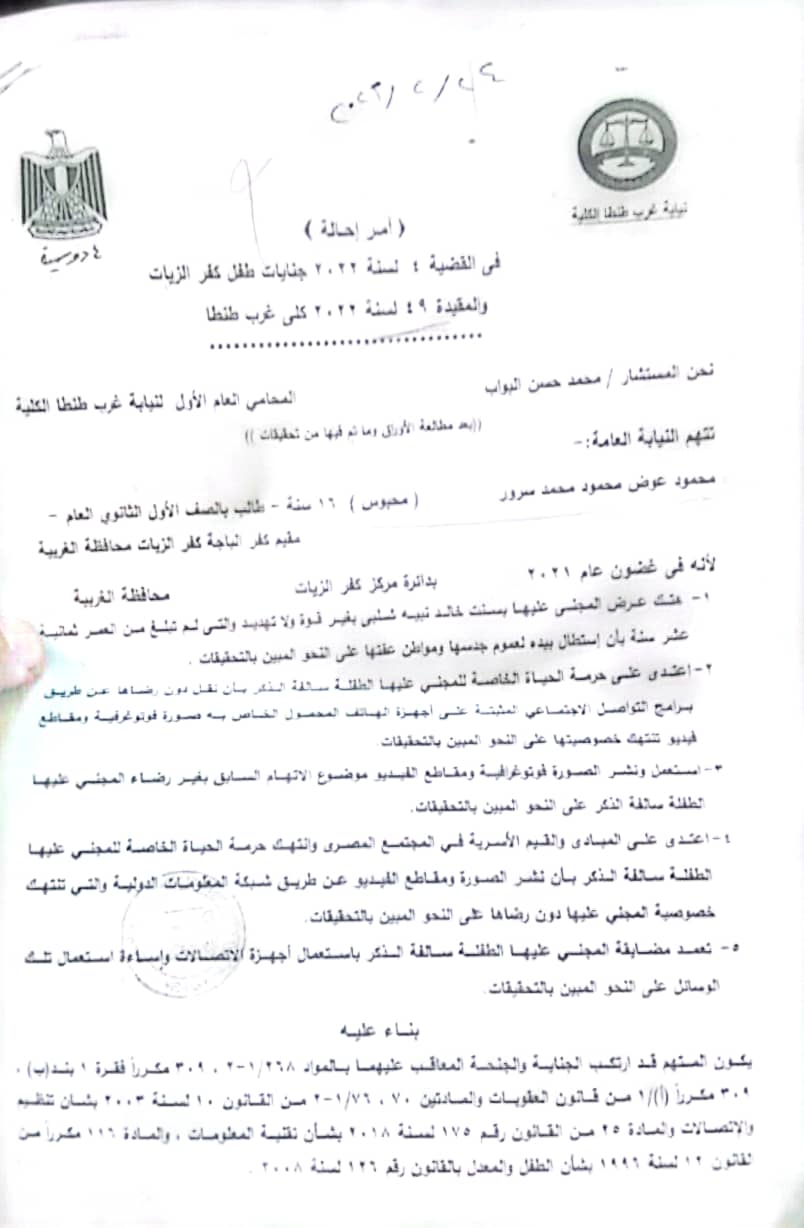 قرر المستشار محمد البواب، المحامي العام الأول لنيابة غرب طنطا الكلية، إحالة محمود عوض سرور طالب بالصف الأول الثانوي، المتهم السادس في واقعة بسنت ضحية الابتزاز بالغربية إلى محكمة الطفل بطنطا الابتدائية، مع استمرار حبسه.