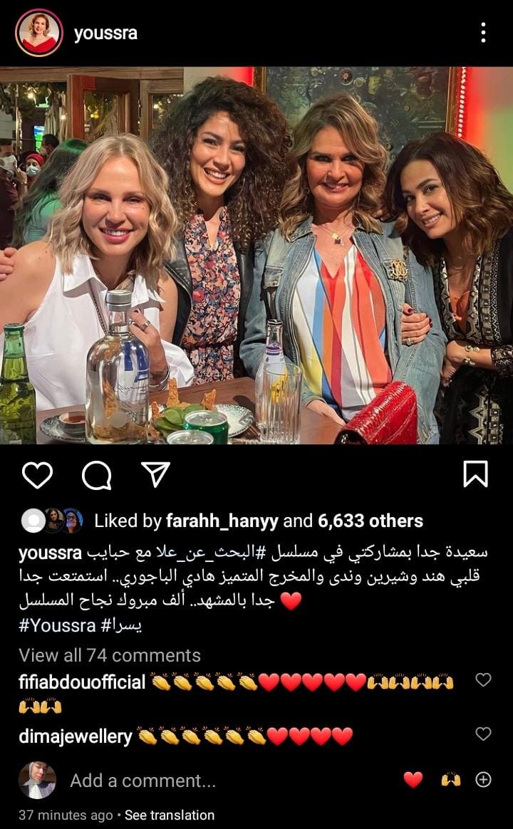 حرصت الفنانة يسرا على الإشادة بفريق عمل مسلسل البحث عن علا، الذي شاركت في أولى حلقاته كضيفة شرف بصحبة الفنانة شيرين رضا، حيث يعرض العمل خلال الفترة الحالية عبر شبكة نتفليكس.