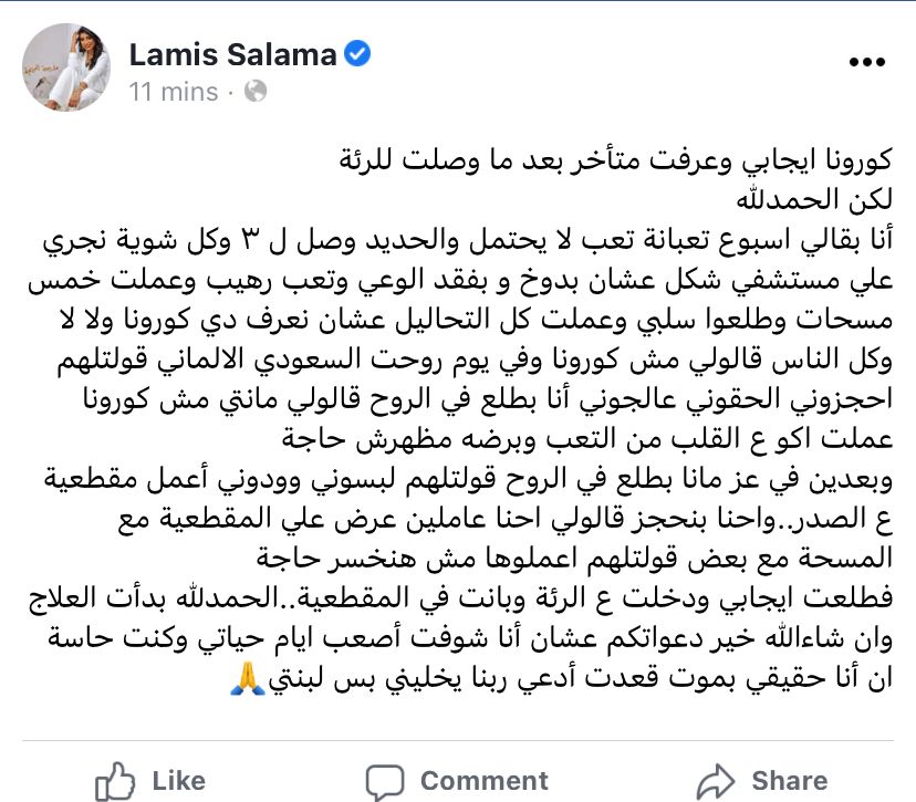 وكتبت لميس سلامة منشورًا عبر حسابها الشخصي بموقع تبادل الصور والفيديوهات القصيرة انستجرام، جاء فيه: كورونا إيجابي، وعرفت متأخر بعد ما وصلت للرئة، لكن الحمد لله..أنا بقالي أسبوع تعبانة تعب لا يحتمل، والحديد وصل لـ 3، وكل شوية نجري على مستشفى شكل، عشان بدوخ وبفقد الوعي وتعب رهيب.